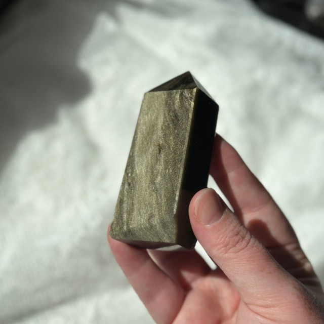 Gold Sheen Obsidian er en beskyttende og jordingsstein, som er spesielt bra for alle som befinner seg i trøbbel eller rett og slett er misfornøyd med livet sitt. Den minner oss om at vi er i stand til å løse våre egne problemer, og oppmuntrer oss til å ta ansvar for retningen livet vårt er på vei. Den avslører forsiktig hva som virkelig fungerer i livet vårt og hva som holder oss tilbake. Den oppmuntrer oss til å gi slipp på menneskene, vanene og troen som ikke lenger tjener oss. Gold Sheen Obsidian hjelper oss å skape balanse i livet vårt, og å dyrke mer fred og glede.
