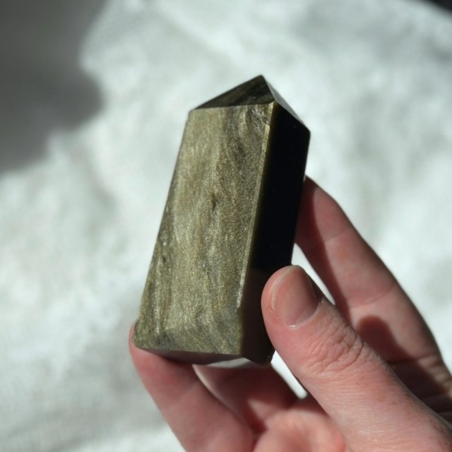 Gold Sheen Obsidian har en lys energi, veldig annerledes enn ren svart Obsidian. Dette er en styrkende stein, men en som også hjelper oss å holde egoet vårt i sjakk slik at de ikke dominerer bevisstheten vår eller kontrollerer handlingene våre. Gold Sheen Obsidian kan hjelpe oss til å "våkne opp" og forstå hva som egentlig skjer i verden rundt oss, og å møte denne virkeligheten uten frykt eller fornektelse. Den inviterer oss i stedet til å ta utfordringen, og til å gjøre en positiv forskjell, uansett hva vi kan.