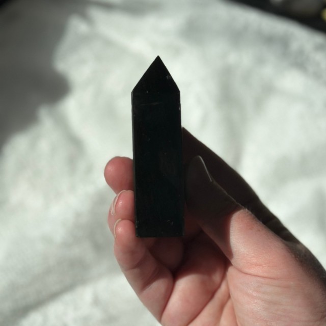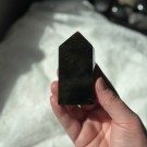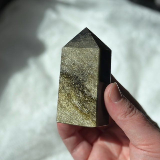 Gullskimmer Obsidian tårn. Dette er 7,8x3,8x2,1cm og veier ca 121g. Minimale småmerker forekommer på denne, bildene er tatt i solskinnslys.
