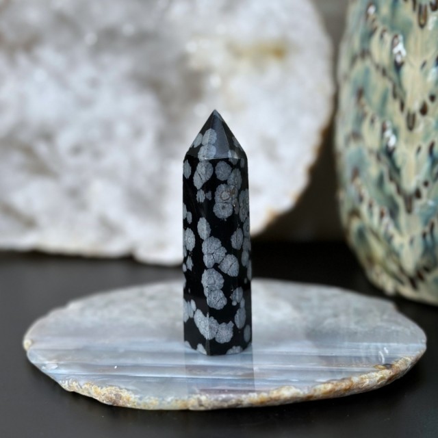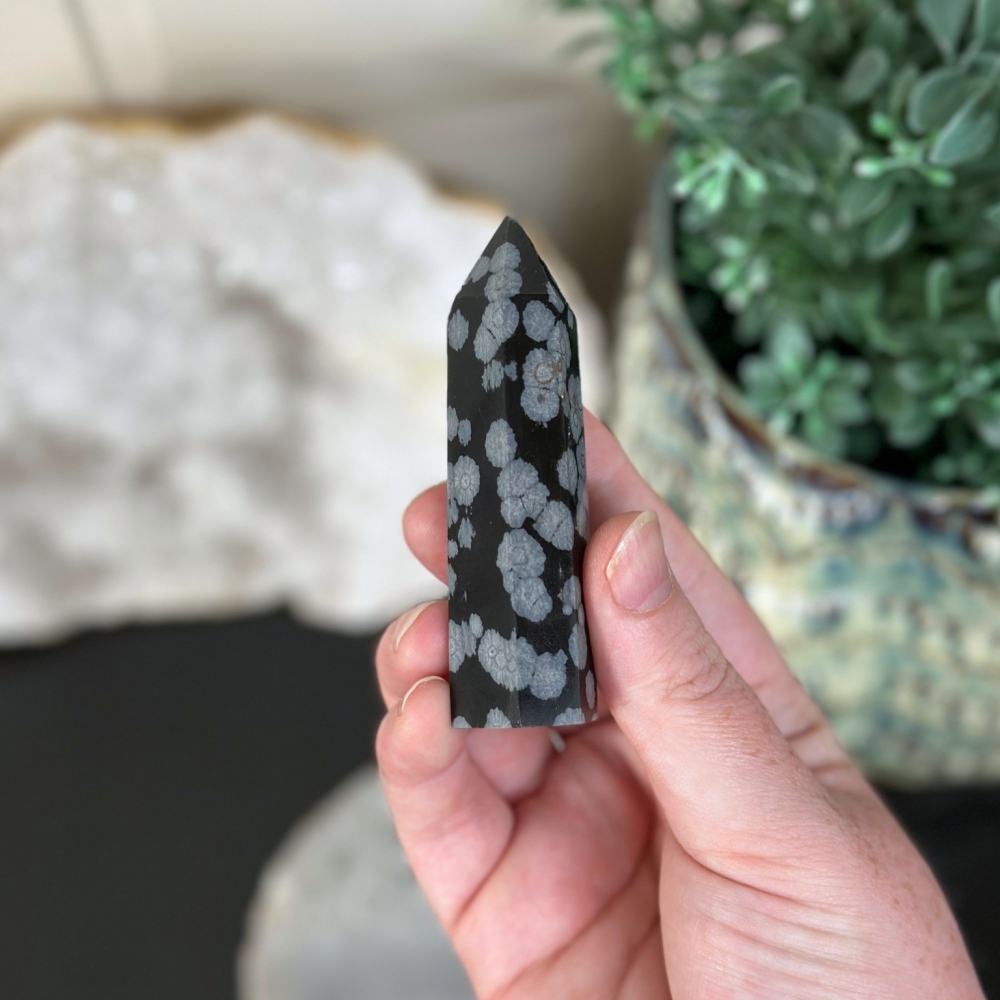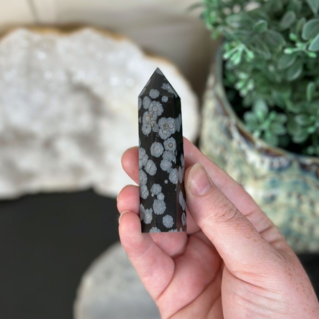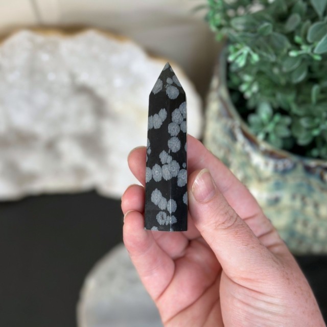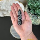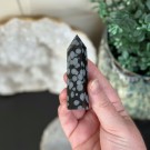Snøfnugg Obsidian tårn. Dette er 9,4cm høyt og veier ca 84g. Det er den krystallen du ser på bildene du får hvis du bestiller denne.