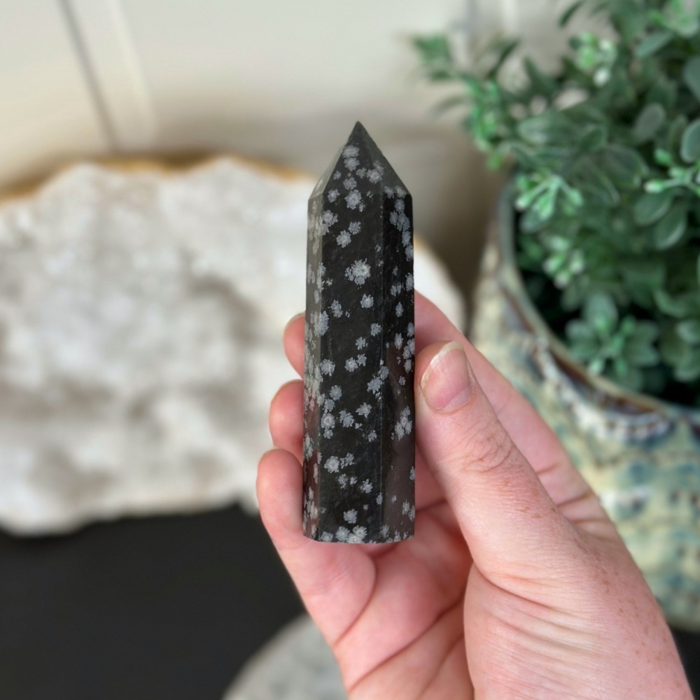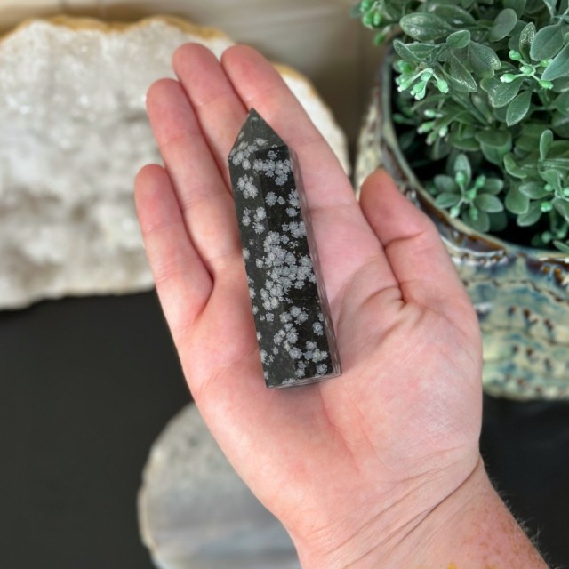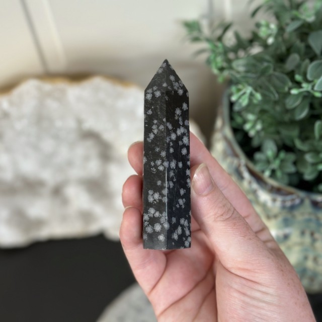 Snøfnugg Obsidian steinen har også den fantastiske evnen til å holde oss jordet og balansert. Denne steinen hjelper oss med å koble oss dypt til jorden og hindrer sinnet vårt i å vandre uendelig. Denne varianten av obsidian hjelper oss å holde oss fokuserte og bestemte på oppgaven, samtidig som den eliminerer den indre utsettelsen som stadig distraherer oss fra å få arbeidet vårt gjort. Snøfnugg Obsidian hjelper med å senke sinnet og bringe det tilbake til virkeligheten. Det er en perfekt stein for alle som har en tendens til å stadig befinne seg i en "dagdrømmetilstand".