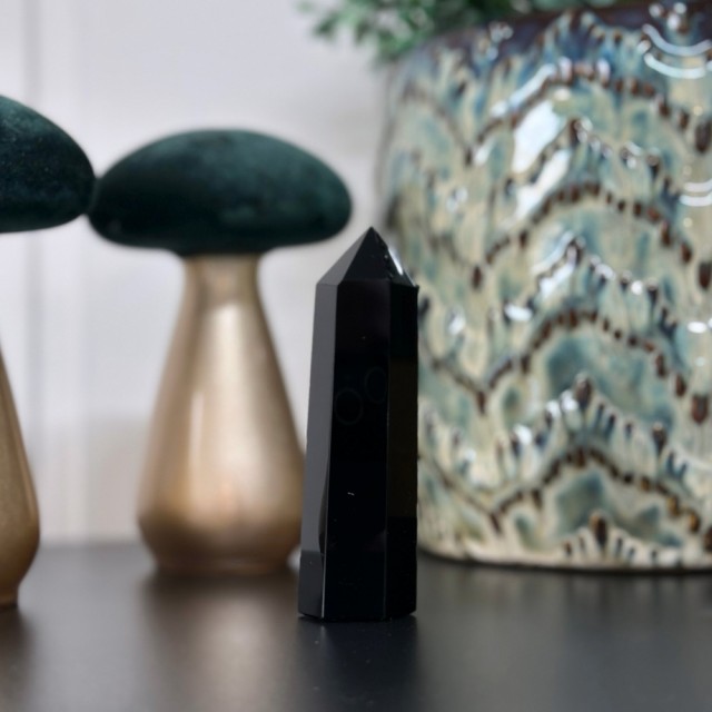 Svart Obsidian (vulkansk glass) tårn fra 8-8,5cm høyde. Det vil bli tilfeldig plukket ut til deg om du bestiller disse.