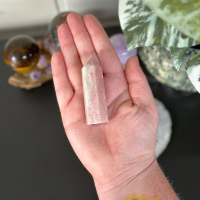 Nydelig Rosa Bånd Kalsitt håndstein. Denne er 6cm lang og 1,5cm tykk. Veier ca 61,9g. Det er den krystallen du ser på bildene du får hvis du bestiller denne. Små minimale merker kan forekomme.