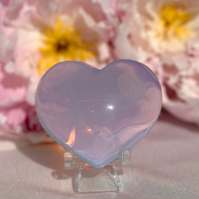 Rosa Opalitt hjerte på 73g og er ca 5,6cm. Opalitt er et menneskeskapt syntetisk glass, feilaktig kjent under en rekke forskjellige navn, inkludert - Tiffany Stone, Opalised Fluorite og Purple Opal. PS: Bildene er tatt i sollys. Denne har en synlig bobble