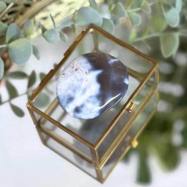 Orca Agat, også kalt Spekkhoggerstein, er en vakker krystall for indre ro, tilgivelse og selvaksept. Den myke blå-hvite energien minner om havets helbredende kraft og spekkhoggerens styrke. Denne er 5,2x4,3x2,2cm og veier ca 62g.
