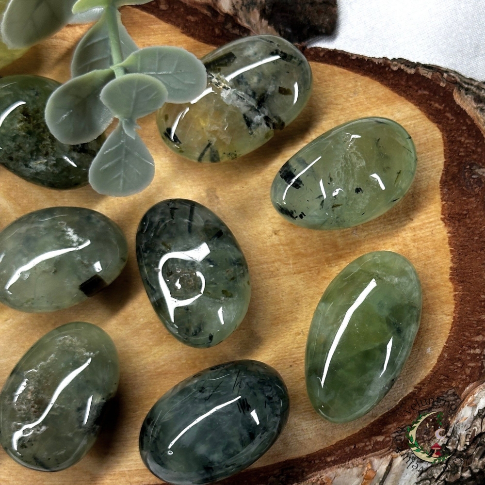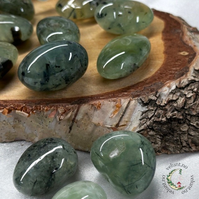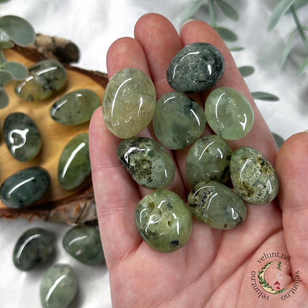 Prehnitt krystallperler med myke grønne toner og naturlige Epidott og Svart Turmalin innslag. Hver perle er unik, og pakken gir et variert utvalg, perfekt til smykkelaging, armbånd og andre magiske DIY-prosjekter. Disse er ca 8-8,5mm og kommer i 10pk.