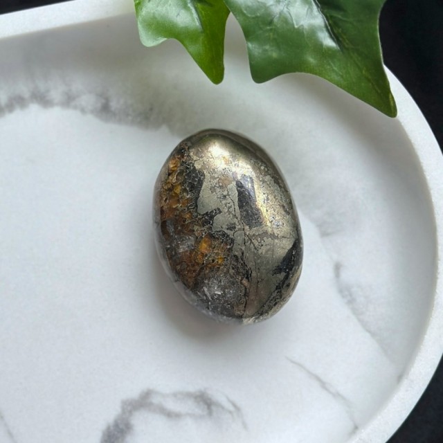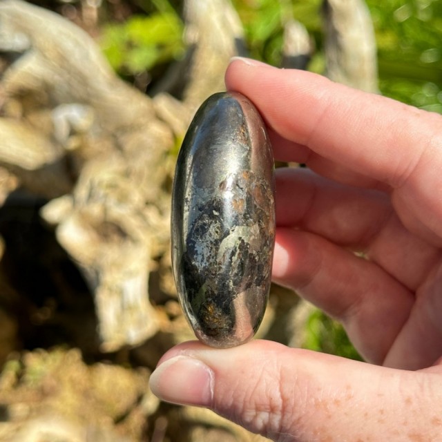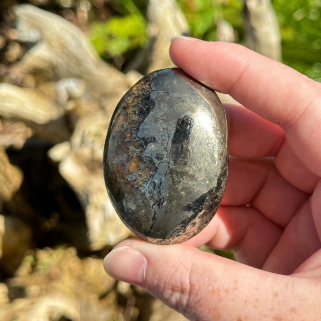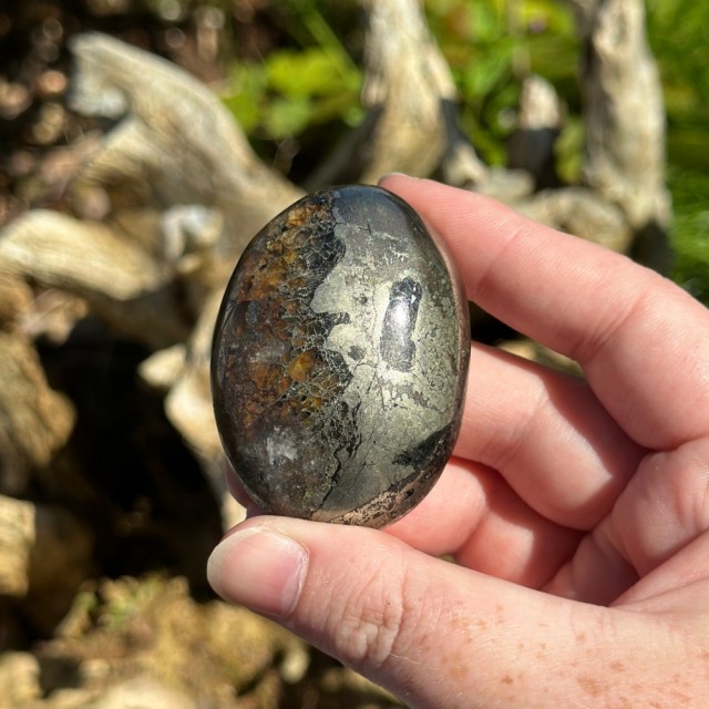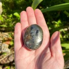 Nydelig unik håndstein av Golden Healer og Pyritt. Denne som du ser på bildene her veier 98g og er ca 5,5cm. Naturlige små merker kan forekomme.