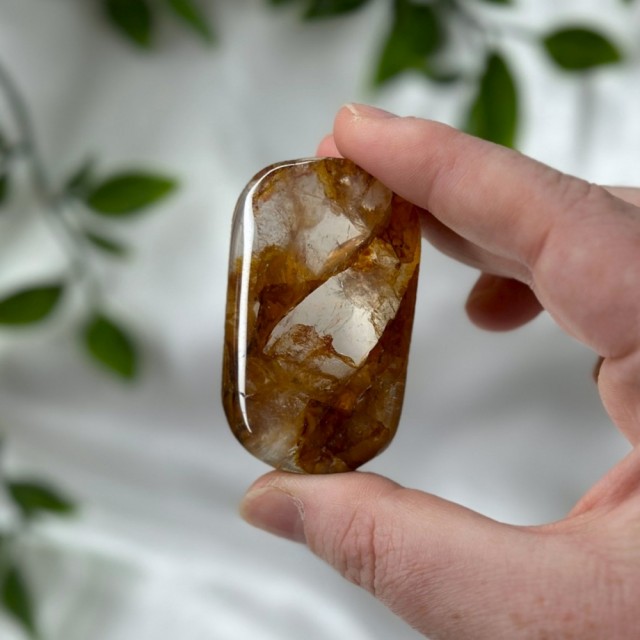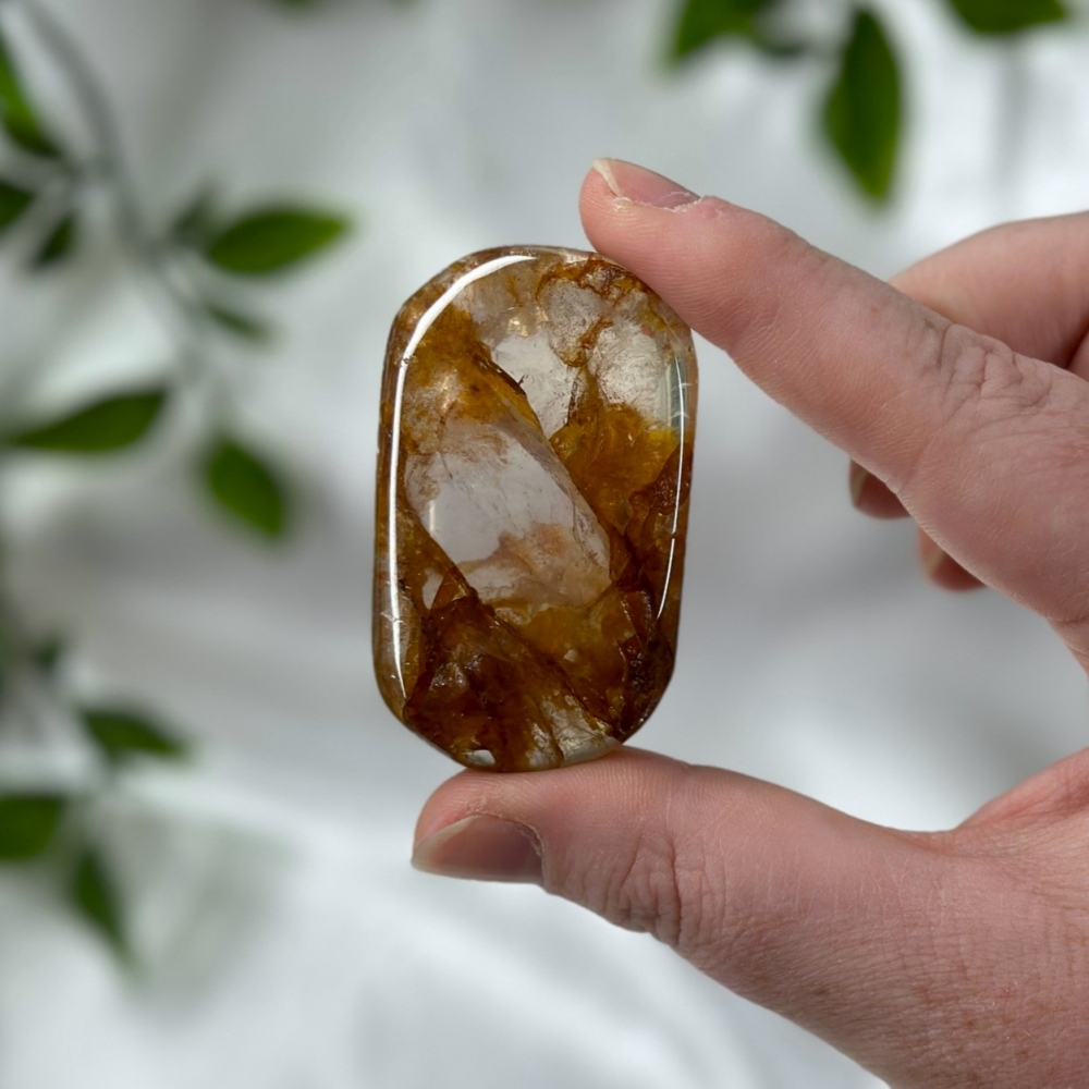 Nydelig unik håndstein av Golden Healer og Pyritt. Denne som du ser på bildene her veier 68g og er ca 5,3cm. Bildene er tatt ute i sollys. Fargene vil variere. Naturlige små merker kan forekomme.