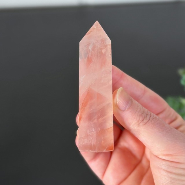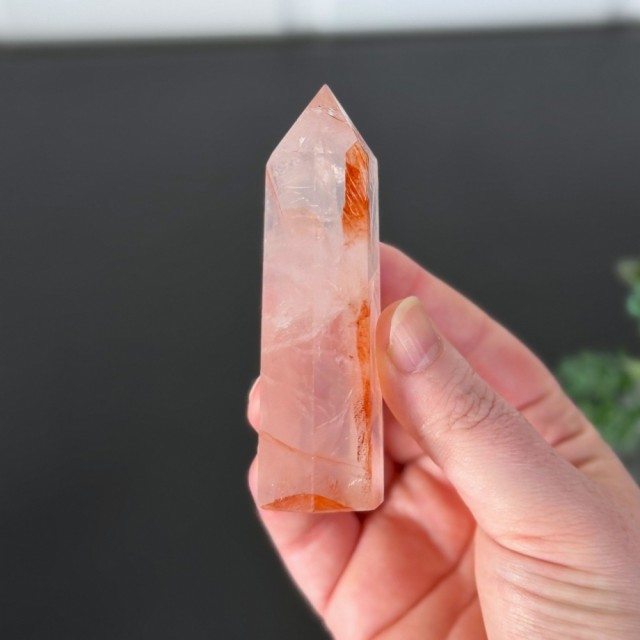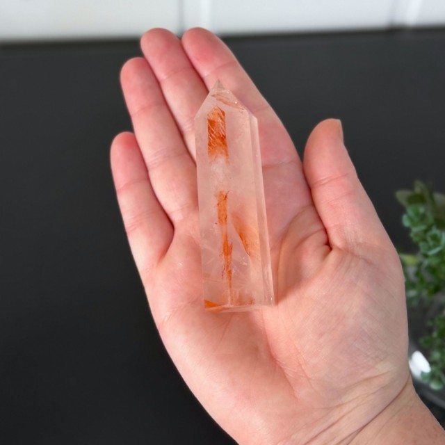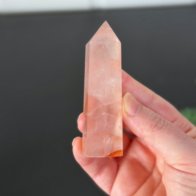 Flammekvarts, også kjent som Hematitt Kvarts eller Fire Quartz, er en kombinasjon av klar kvarts og jernoksid. Det er nettopp jernet som skaper de flammende innslagene i rødt, oransje og rosa nyanser, og gir krystallen sitt levende uttrykk.