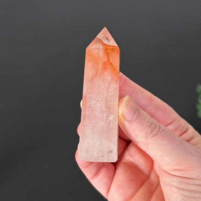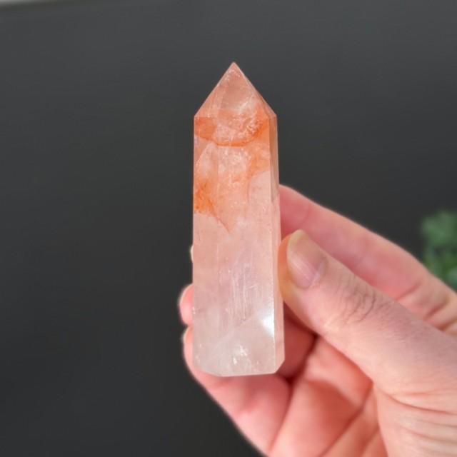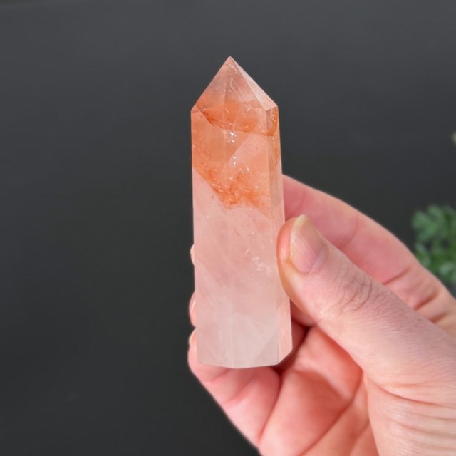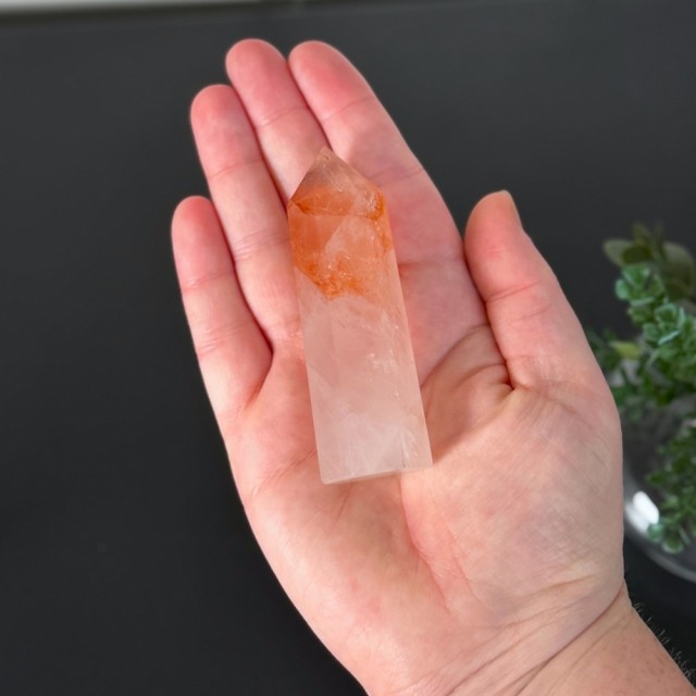 Flammekvarts, også kjent som Hematitt Kvarts eller Fire Quartz, er en kombinasjon av klar kvarts og jernoksid. Det er nettopp jernet som skaper de flammende innslagene i rødt, oransje og rosa nyanser, og gir krystallen sitt levende uttrykk.