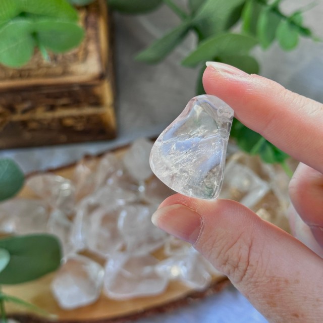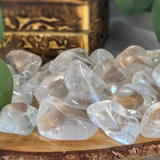 Ovale Bergkrystall tromlet stein. Disse er ca 17-37g og 3-4,5cm. **OBS: Redusert pris pga små merker på dem! Se bilder for mer informasjon. Disse kan inneholde spor av Hematitt, Limonitt og Hagekvarts. Tilfeldig plukket.