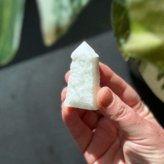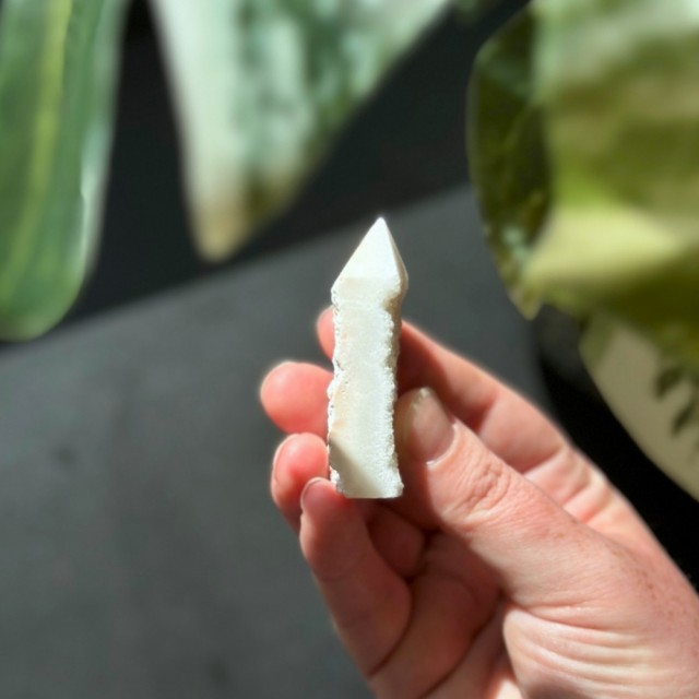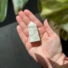 Nydelig Grønn Sardonyks tårn. Dette veier ca 88g og er 8,5cm høy. Det er den krystallen du ser på bildene du får hvis du bestiller denne. Bildene er tatt ute i sollys.
