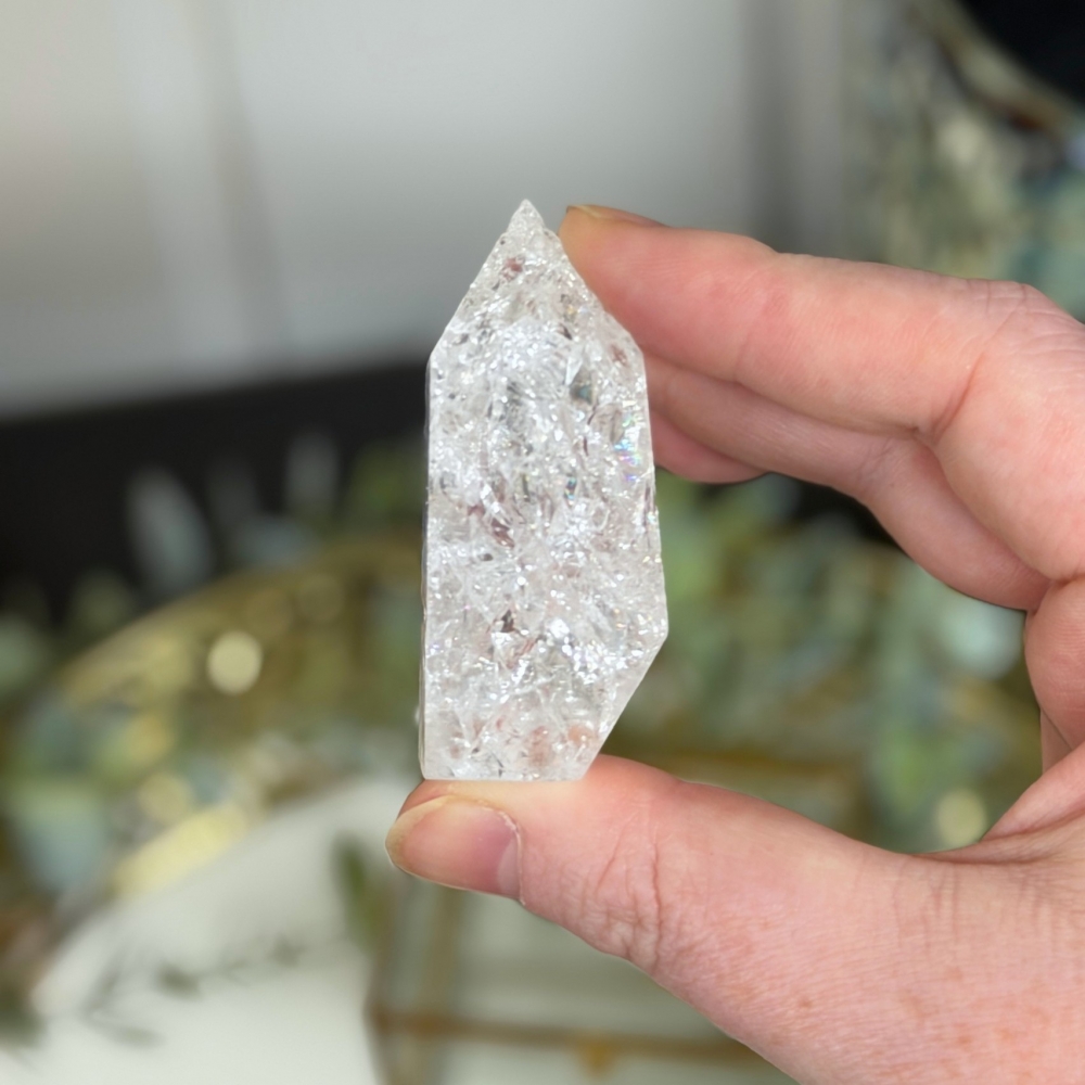 Fire & Ice Bergkrystall, også kjent som Crackle Quartz er en unik og kraftfull variant av bergkrystall som kombinerer elementene ild og is, både symbolsk og fysisk. Den indre strukturen, fylt med fine sprekker og regnbueglimt, sies å representere indre brudd, forvandling og heling. Mange ser på denne krystallen som et symbol på at det som en gang var knust, kan bli vakkert, helbredet og enda sterkere.