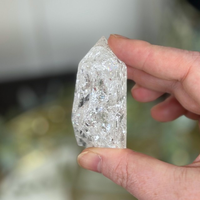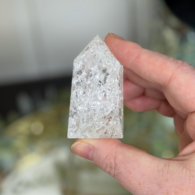 Crackle Quartz er kjent for å forsterke meditasjon, intuitiv innsikt og høyfrekvent energiarbeid. Den åpner ofte opp for spirituelle gjennombrudd og dypere forbindelse til universell visdom, og passer godt til intensjonsarbeid, healing og å manifestere forandring. Mange opplever at den hjelper med å skape ny energi etter perioder med følelsesmessig opprydding.