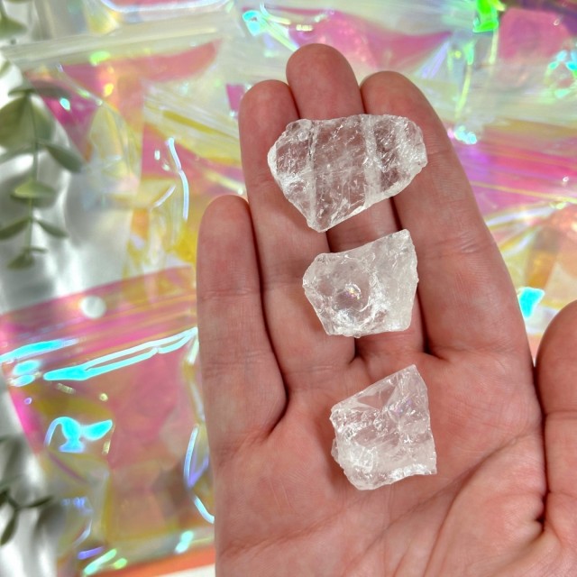 Kvarts råbiter. I denne posen får du med deg 3stk små/mini kvarts råbiter. Prisen er per pakke med 3x inni. Størrelse vil variere fra 1-2cm, disse er tilfeldig pakket inn.