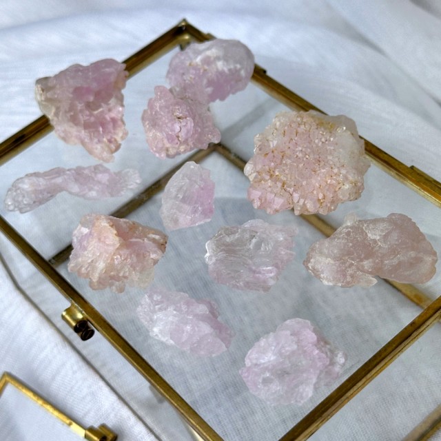 Du har sikkert sett polert og rå Rosenkvarts, men her har vi noen nydelige miniatyr Rosenkvartsklynger. I denne pakken får du med 3 stk. Disse er forhåndspakket og det vil bli tilfeldig plukket ut. OBS: Disse er MINI som vil si 0,5-2mm per stk.