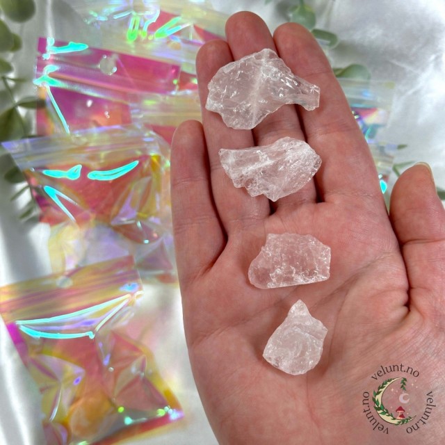 Rosenkvarts Råbiter, i denne posen får du med deg 4 mini råbiter av Rosenkvarts. Prisen er per pose med 4stk.