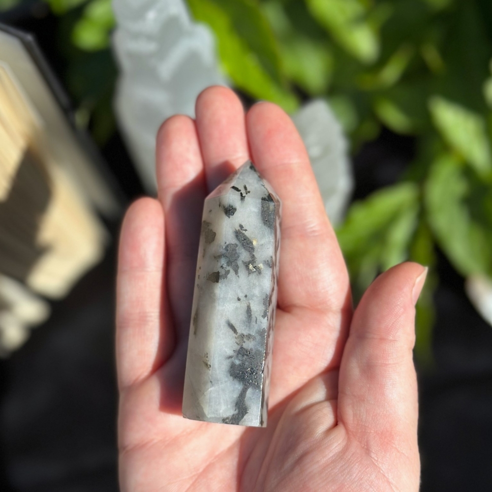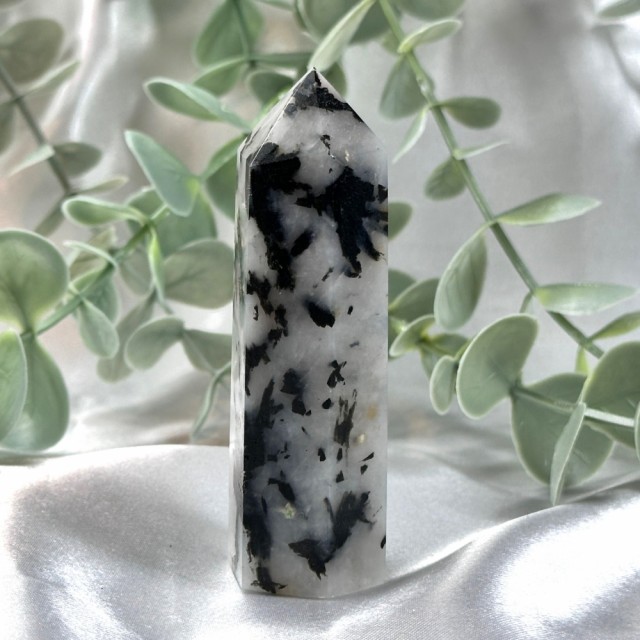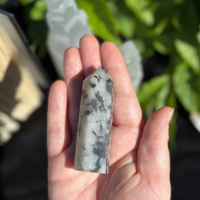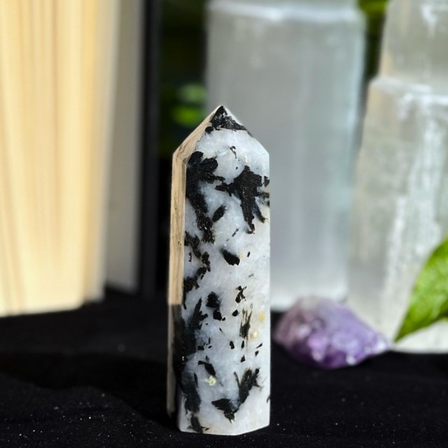 Turmalinkvarts bærer både natt og dag i sitt indre - en unik krystall som forener lys og mørke i perfekt harmoni. Den gir balanse, trygghet og klarhet på veien videre, og minner deg om at selv kontraster kan skape skjønnhet. Vekt: 256g Str: 5,6cm.