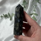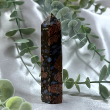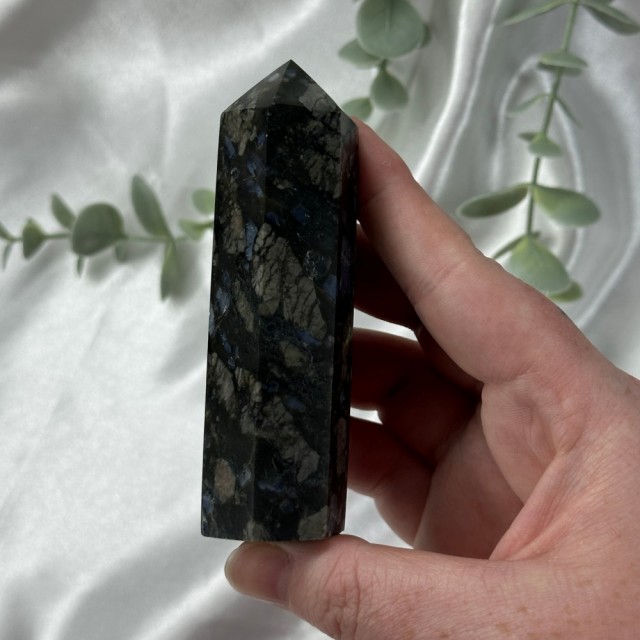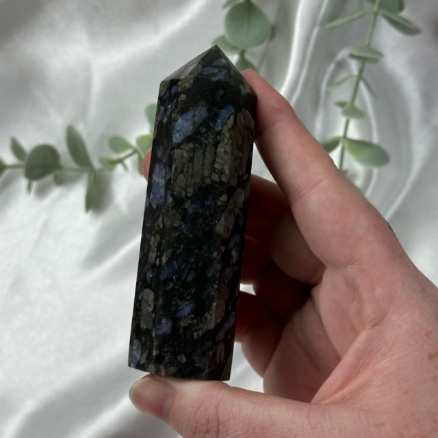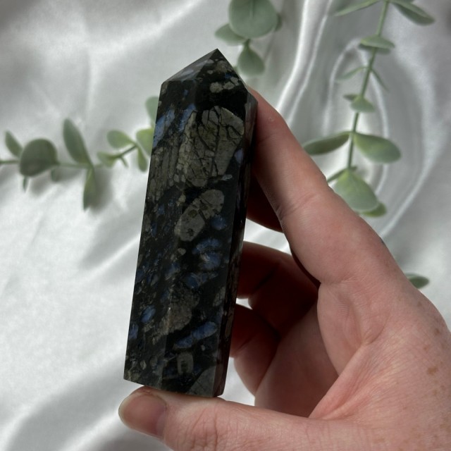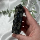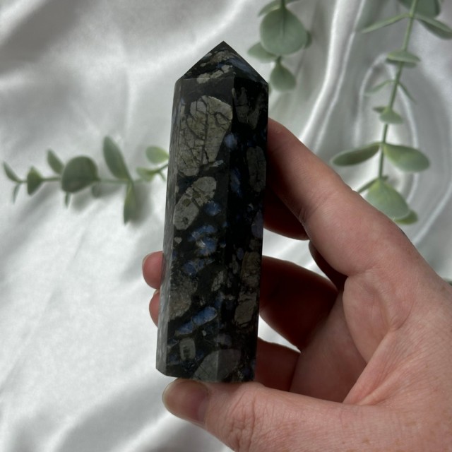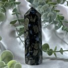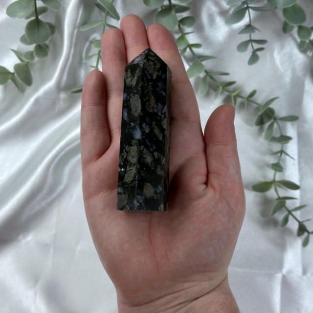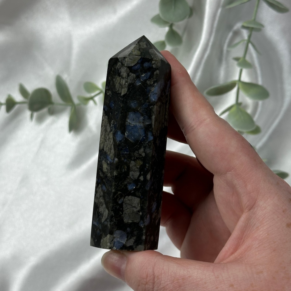 Blå Aragonitt er en beroligende stein som minner om stillheten i havet. Den lindrer stress, styrker kommunikasjon og bringer fred, klarhet og egenkjærlighet. Dette tårnet er 101g og er 9,5cm høyt.