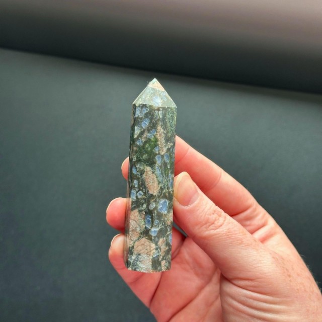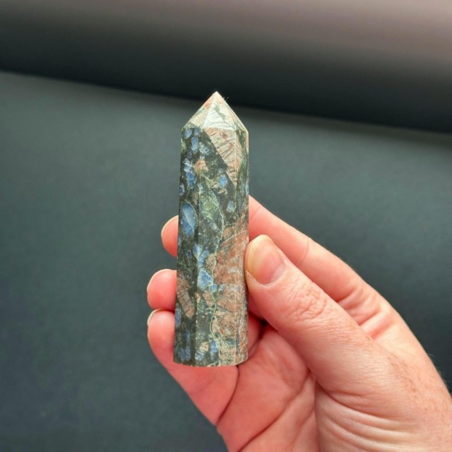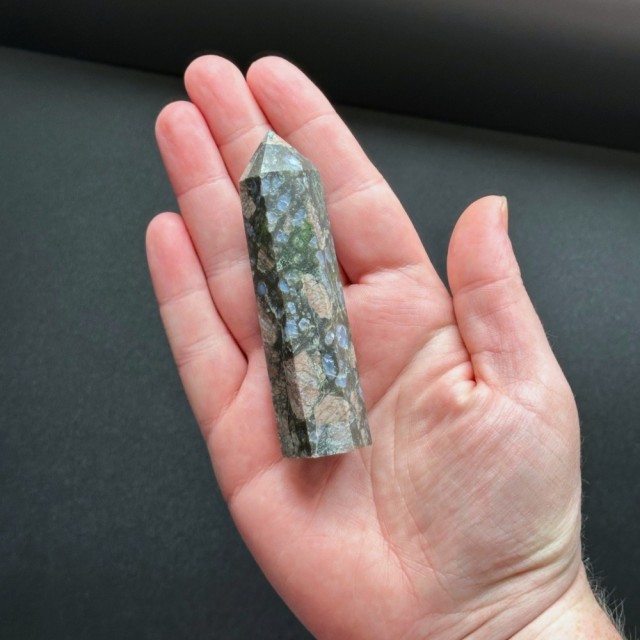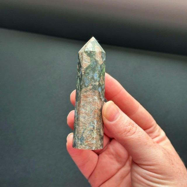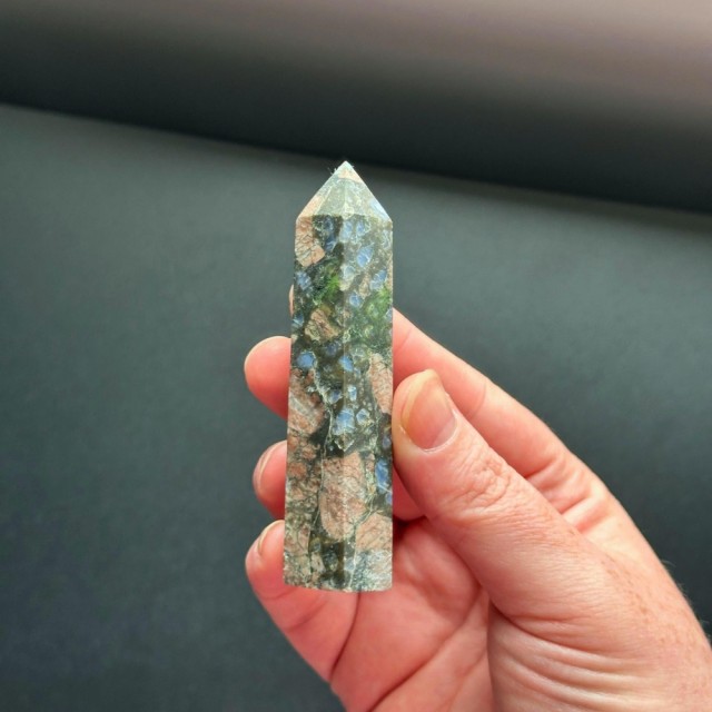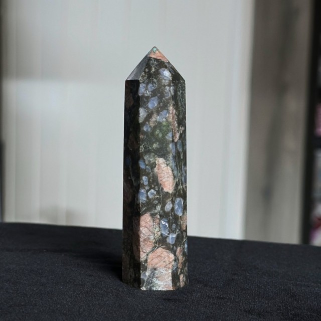 Que Seraens skapelse skjedde under et sentralt punkt i jordens formasjon for omtrent 1 milliard år siden. Dette er en vulkansk bergart med forskjellige sammensatte mineraler. Dette tårnet er 8,7cm og veier ca 73g.