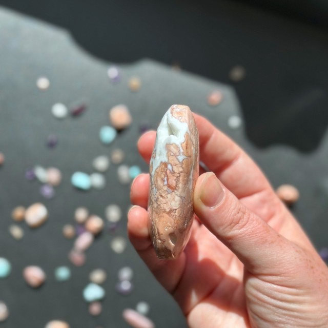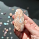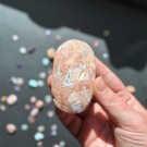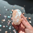 Liten Cotton Candy Agate/Rosa Agat håndstein. Denne er 5,6x3,3x1,3cm og veier 41g. Dette er en relativ ny stein, den sies å være av hvit Kalsedon med Jaspis nyanser av rosa og fersken farge.