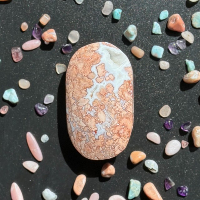 Rosa Agat - Dette er en relativ ny stein, den sies å være av hvit Kalsedon med Jaspis nyanser av rosa og fersken farge. Disse er jumbo størrelse (store). Ca 2,5-4cm lange og veier ca 26-54g. Tilfeldig plukket. OBS: Naturlige merker/groper forekommer!