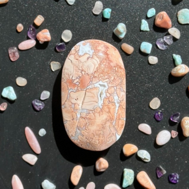Nydelig rosa Sjø Jaspis håndstein. Denne er 5cm og veier ca 53,3g. Det er den på bildene du får hvis du bestiller denne. Vær obs på at minimale små merker kan forekomme. Bildene er tatt under dagslys, produkt kan avvike fra bildene. Se nøye før kjøp.