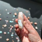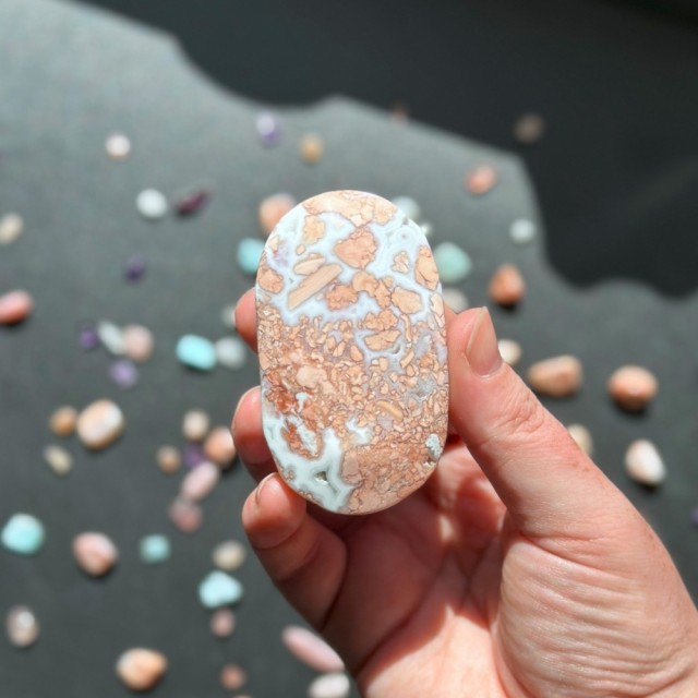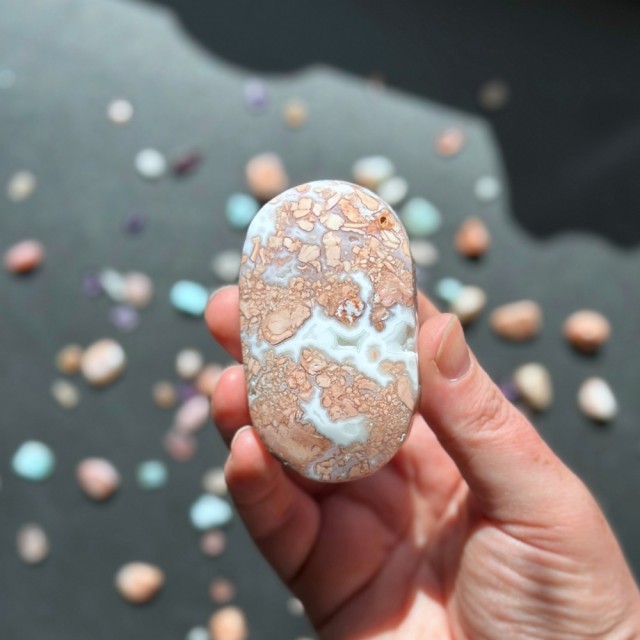 Liten Cotton Candy Agate/Rosa Agat håndstein. Denne er 5,6x3,3x1,3cm og veier 41g. Dette er en relativ ny stein, den sies å være av hvit Kalsedon med Jaspis nyanser av rosa og fersken farge.