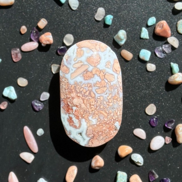 Rosa Agat - Dette er en relativ ny stein, den sies å være av hvit Kalsedon med Jaspis nyanser av rosa og fersken farge. Disse er jumbo størrelse (store). Ca 2,5-4cm lange og veier ca 26-54g. Tilfeldig plukket. OBS: Naturlige merker/groper forekommer!