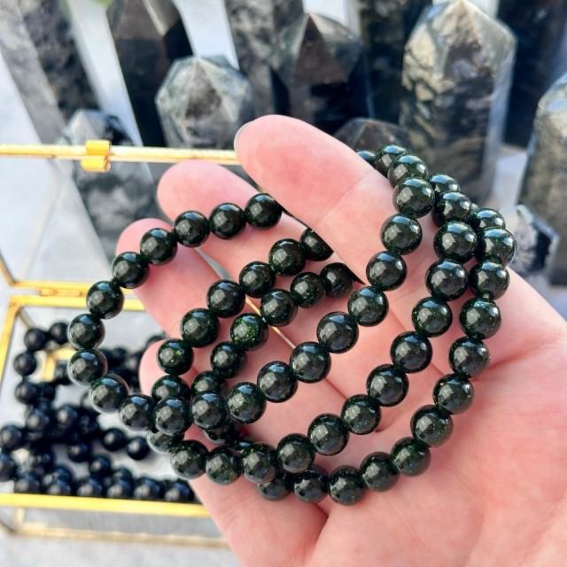 Disse armbåndene er 8mm. Den er laget ved å smelte Silika, Boraks, Kobberoksid og andre kjemikalier. Den har hovedsakelig en rødbrun eller gylden farge med kobberflekker. Gull Stjernestein er glatt og polert med reflekterende inneslutninger.