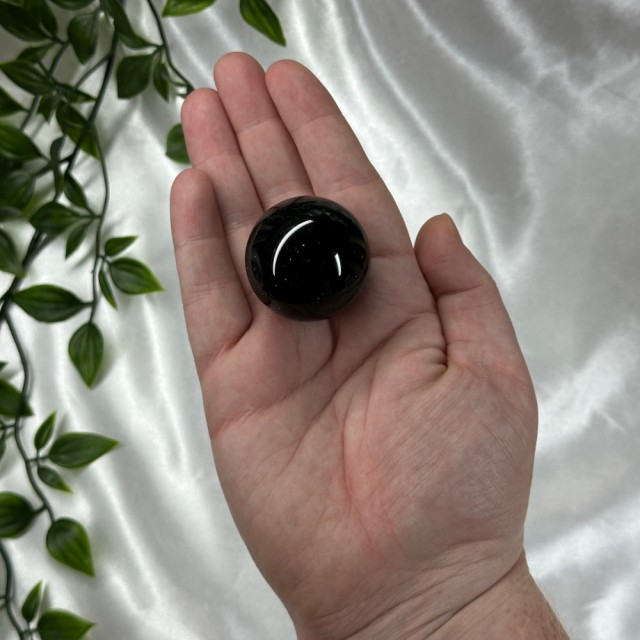 Svart Månestein (Black Moonstone) håndstein på 56g og har målene 5x4,3x1,9cm. Små merker forekommer.