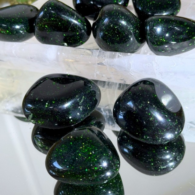 Grønn Stjernestein er en stein full av liv og bevegelse. De små glitrende partiklene gir en følelse av dybde, nesten som en stjernehimmel fanget i grønt.