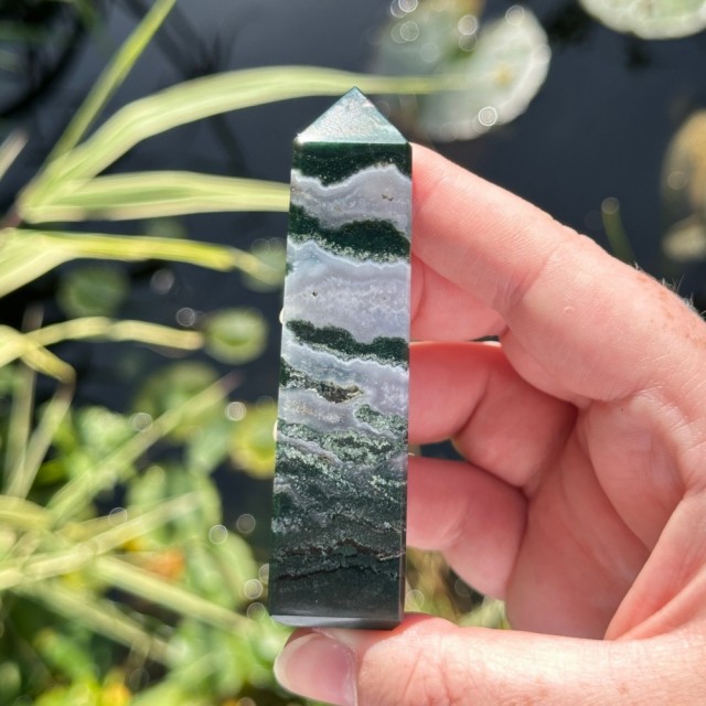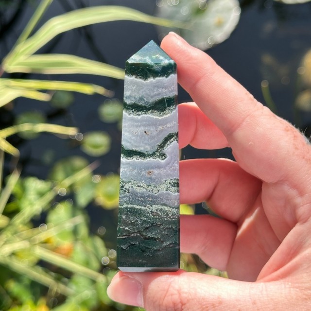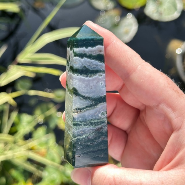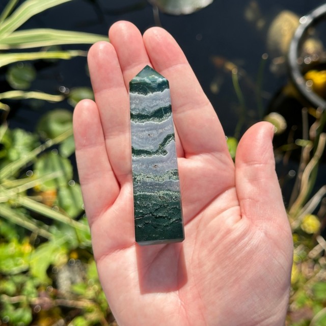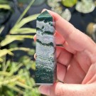 Nydelig Grønn Sardonyks tårn. Dette veier ca 88g og er 8,5cm høy. Det er den krystallen du ser på bildene du får hvis du bestiller denne. Bildene er tatt ute i sollys.