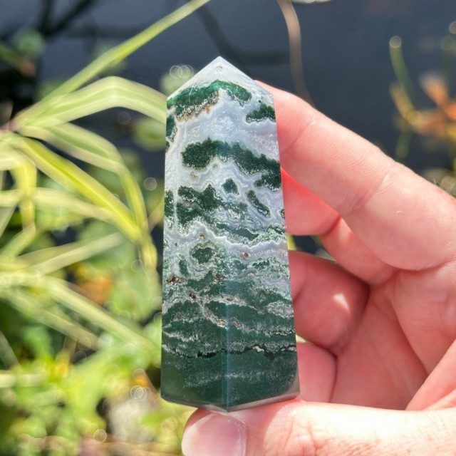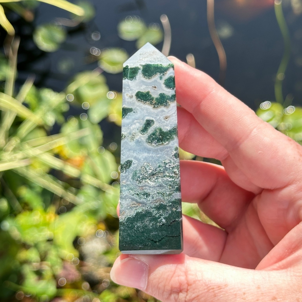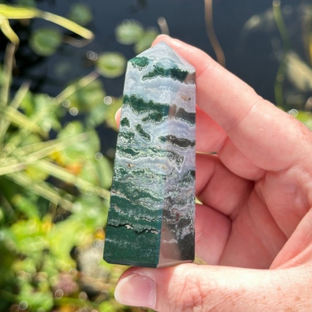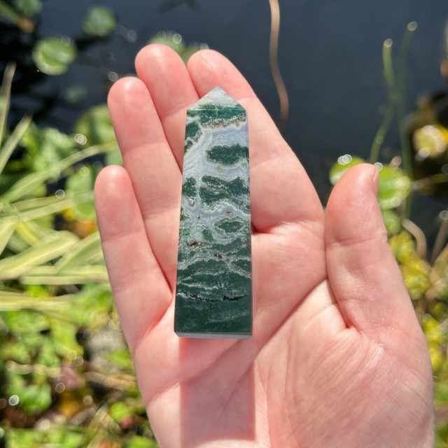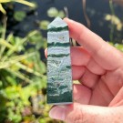 Nydelig Grønn Sardonyks tårn. Dette veier ca 83g og er 8,9cm høy. Det er den krystallen du ser på bildene du får hvis du bestiller denne. Bildene er tatt ute i sollys.