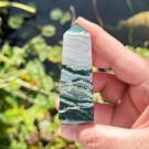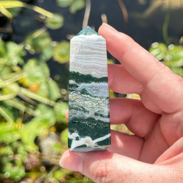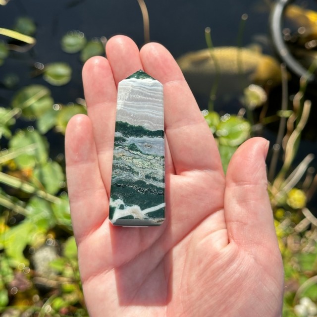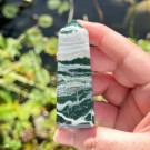 Nydelig Grønn Sardonyks tårn. Dette veier ca 91g og er 7,9cm høy. Det er den krystallen du ser på bildene du får hvis du bestiller denne. Bildene er tatt ute i sollys.
