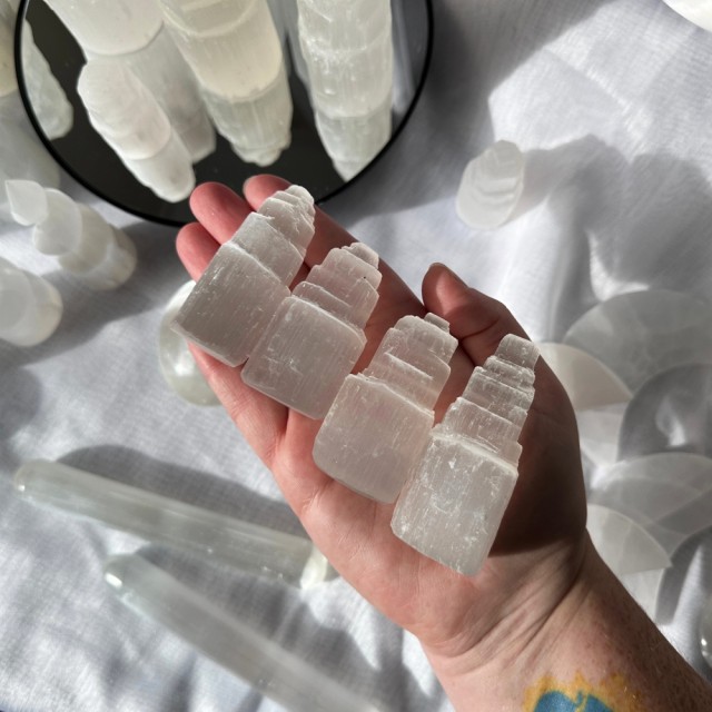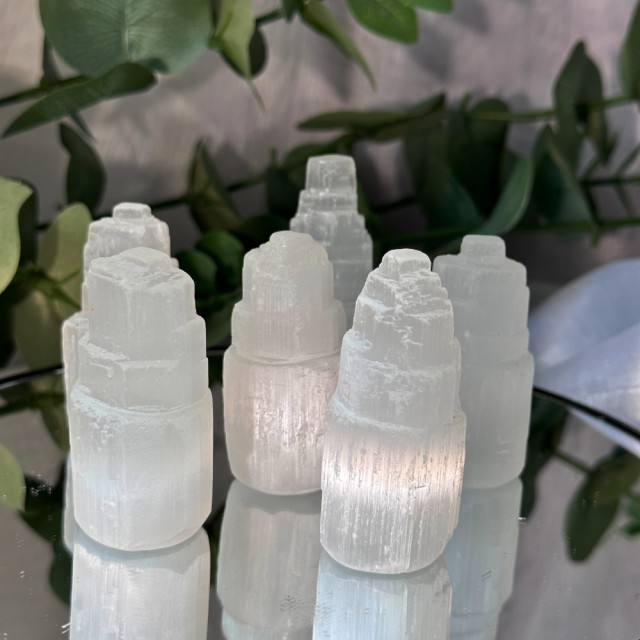 Mini Selenitt Isberg tårn fra Marokko. Disse er ca 5-6cm høye og veier rundt ca 70-90g stk. Selenitt er en utrolig skjør krystall og kommer som regel med små merker på seg fra frakt. – så delikat at så mye at selv en negl kan få steinen til å ripe.