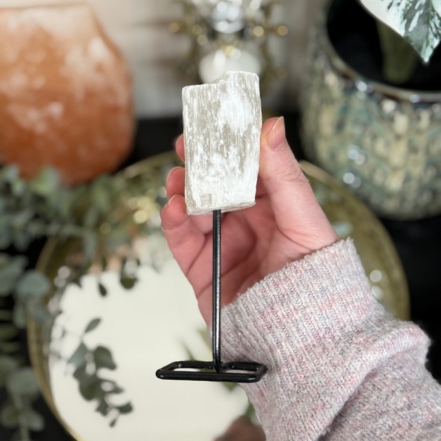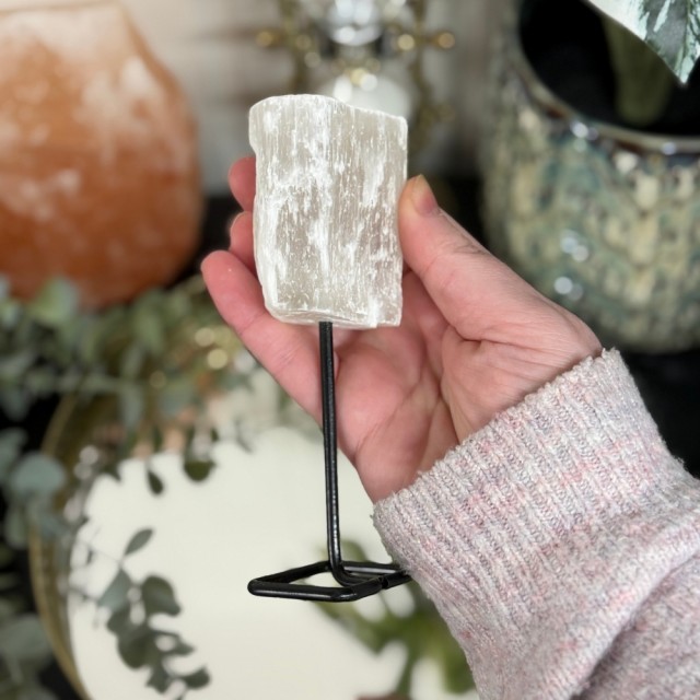 Selenitt er en utrolig skjør krystall og kommer som regel med små merker på seg fra frakt. Den er faktisk så delikat at så mye at selv en negl kan få steinen til å få riper. Denne er ca 14cm høy.