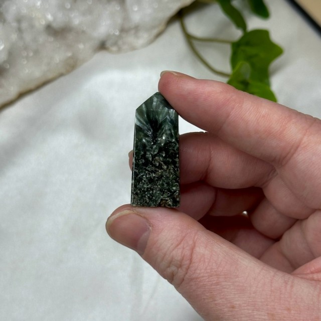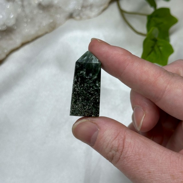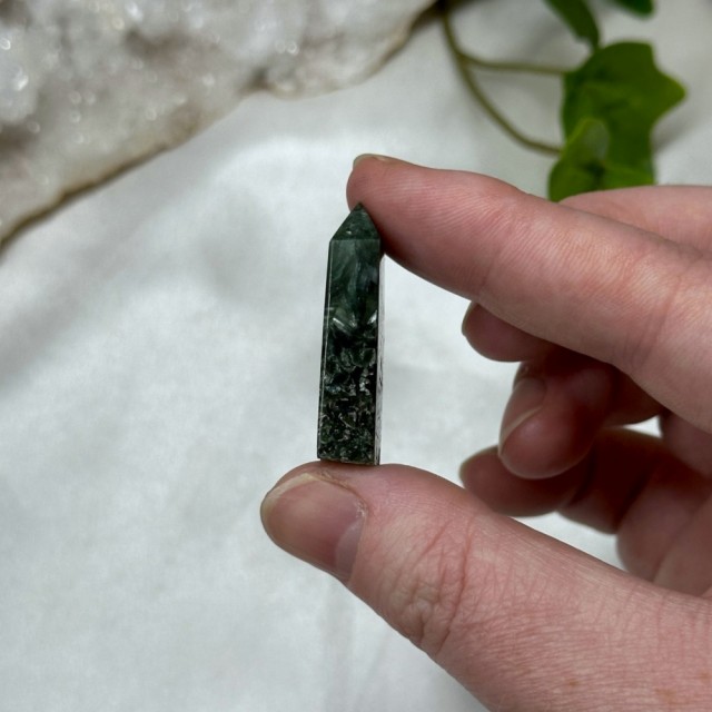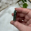 Nydelig Grønn Sardonyks tårn. Dette veier ca 91g og er 7,9cm høy. Det er den krystallen du ser på bildene du får hvis du bestiller denne. Bildene er tatt ute i sollys.