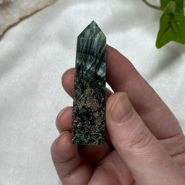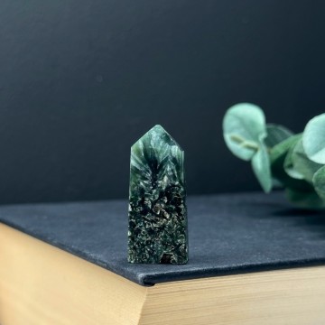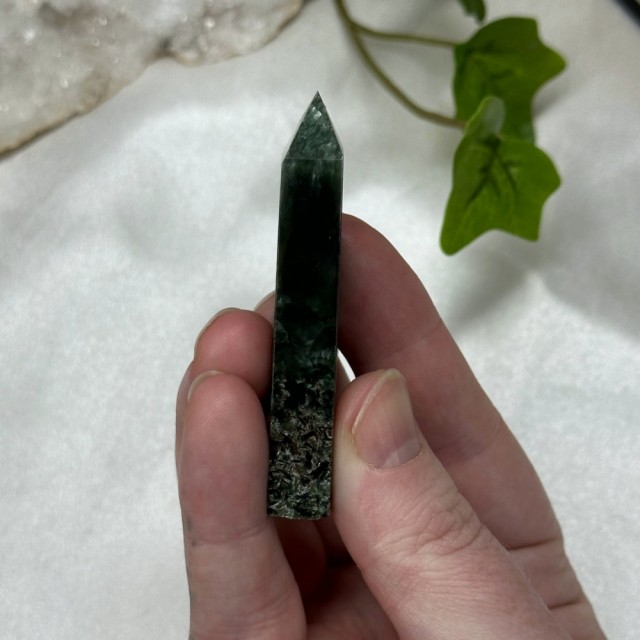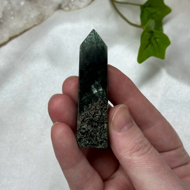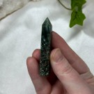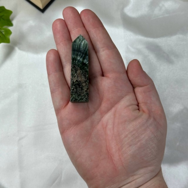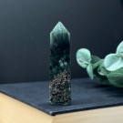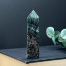 Nydelig Grønn Sardonyks tårn. Dette veier ca 83g og er 8,9cm høy. Det er den krystallen du ser på bildene du får hvis du bestiller denne. Bildene er tatt ute i sollys.