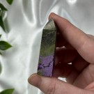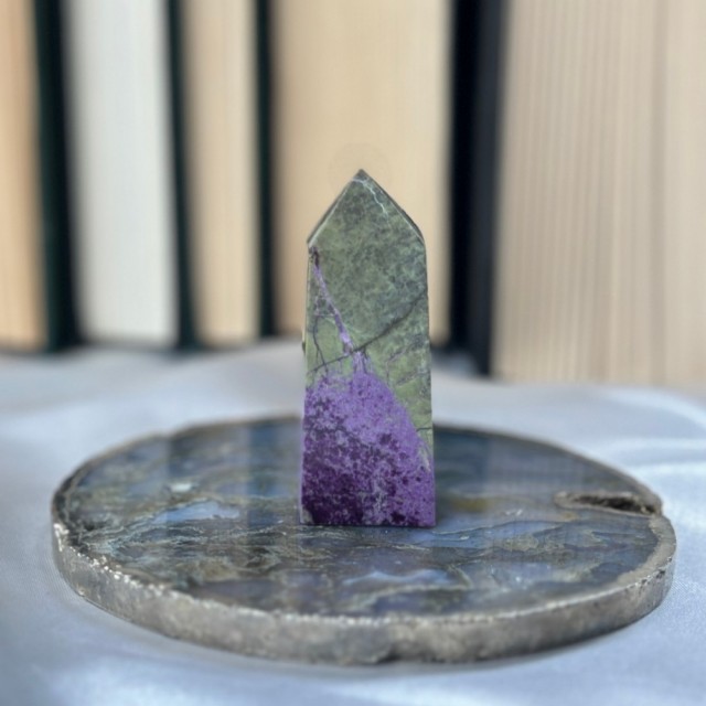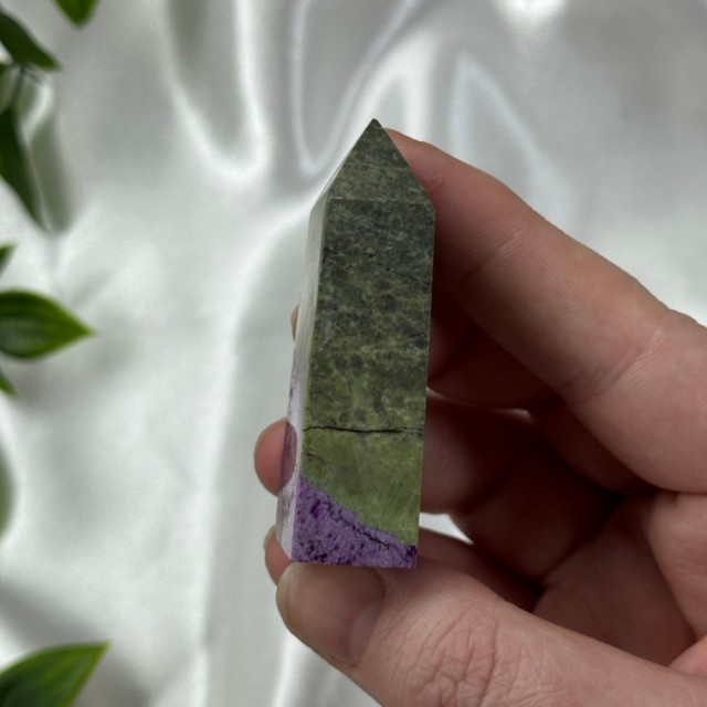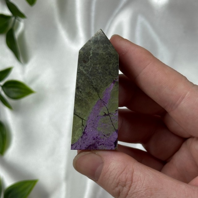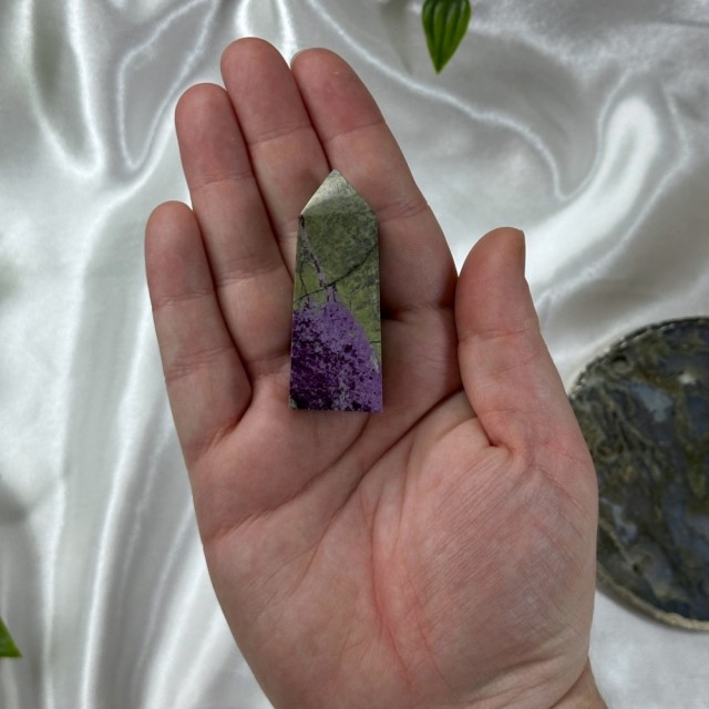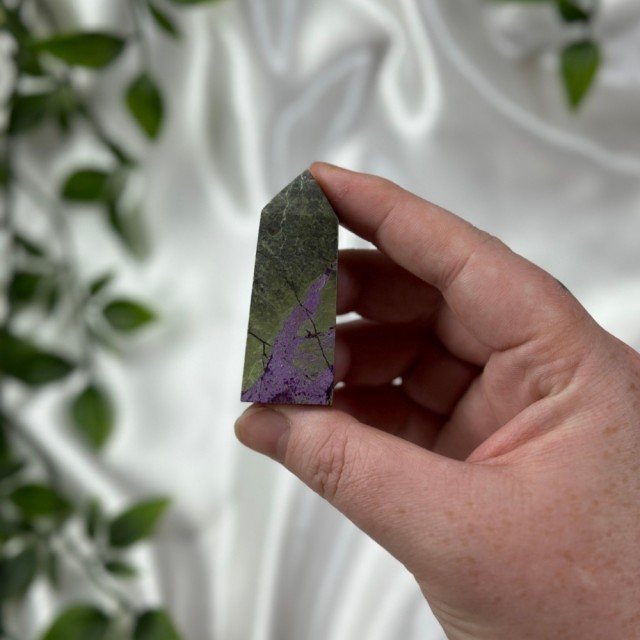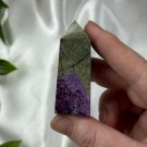 Candy Jaspis, en grønn og brun Jaspis fra Pakistan. Det hvite på krystallen er kvarts inneslutninger. Dette tårnet er 12cm høyt og veier ca 260g. OBS: miniatyr liten skade på toppen - kjøpt sånn.