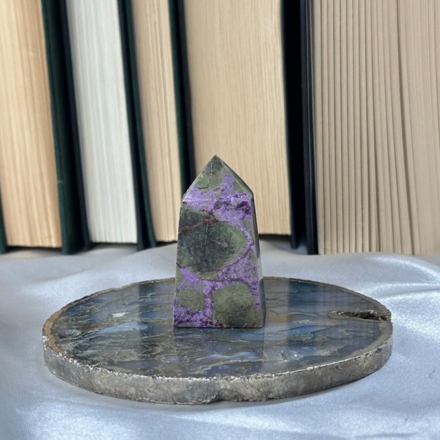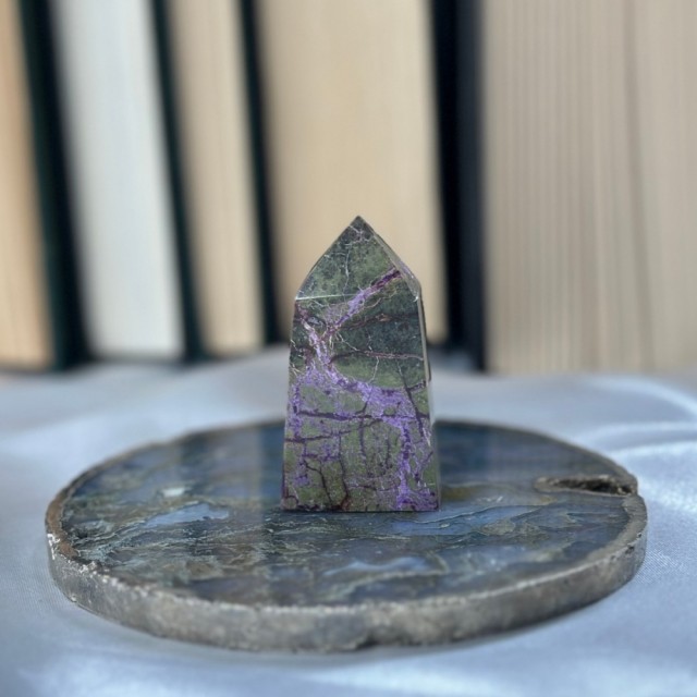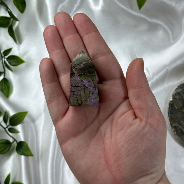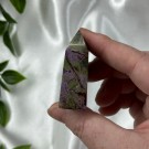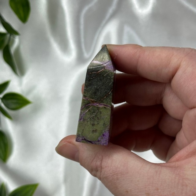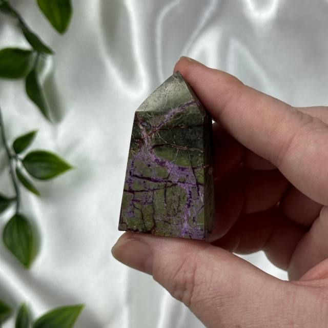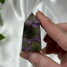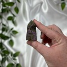 Candy Jaspis, en grønn og brun Jaspis fra Pakistan. Det hvite på krystallen er kvarts inneslutninger. Dette tårnet er 11,8cm høyt og veier ca 288g.