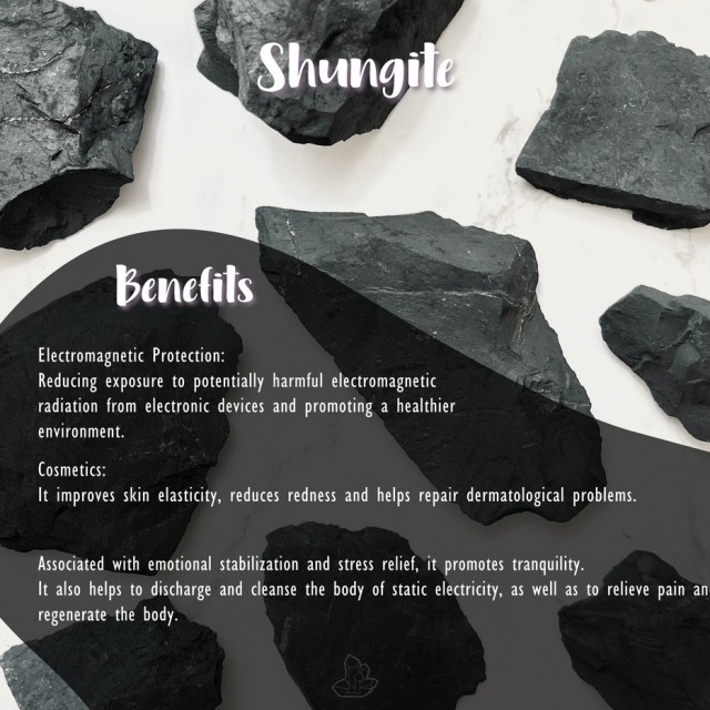 Shungitt er en naturlig, karbonrik stein som ofte forbindes med absorberende og beskyttende egenskaper. Mange bruker den i nærheten av mobil, PC og annet elektronisk utstyr for å skjerme mot elektromagnetiske felt og “elektrisk støy” i omgivelsene.