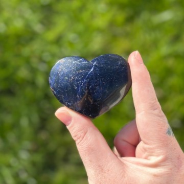 Magisk og mørkt Sodalitt hjerte på 4,8x6,3x2,5cm og veier ca 89g. Det er den krystallen du ser på bildene du får hvis du bestiller denne. Husk, alle bildene er tatt i studiolys/sollys. Er mørkere i virkeligheten uten skarpt lys.