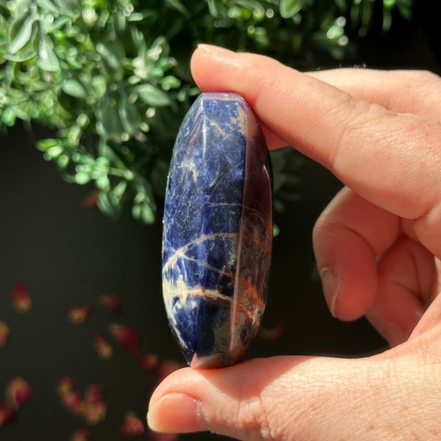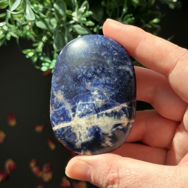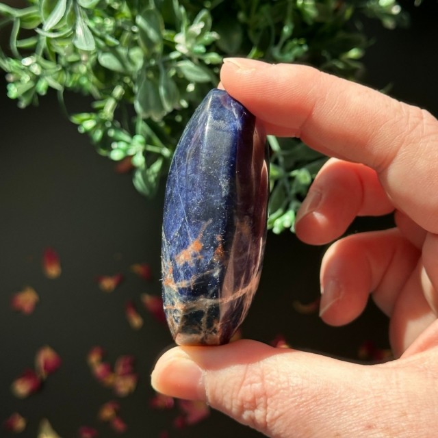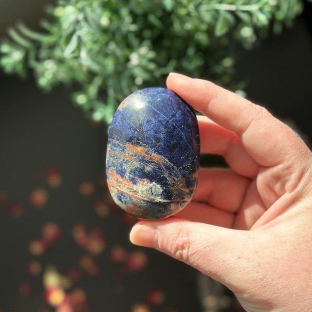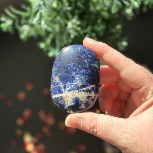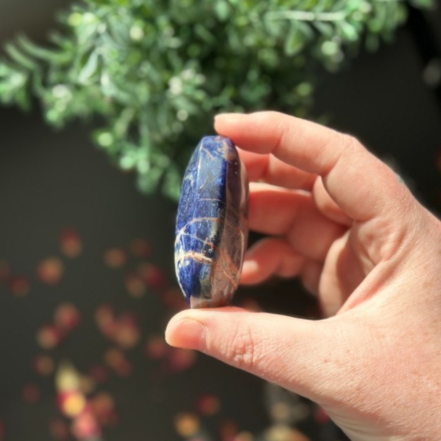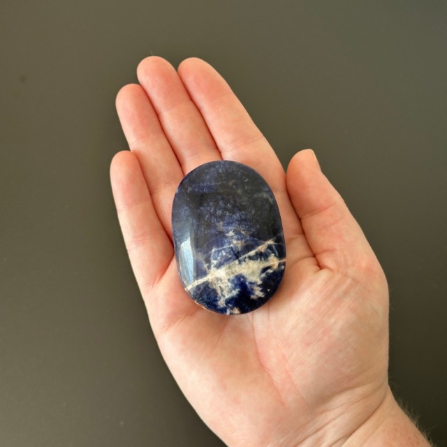 Nydelig mørkeblå Sodalitt håndstein. Denne er 6cm og veier ca 86g. Det er den krystallen på bildene du får hvis du bestiller denne.