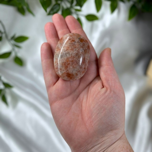 Her har du den fantastiske Solsteinen! Dette er en stein vi kaller "En glad stein" eller "Lykkestein". Denne håndsteinen er 5,9cm lang og veier ca 101g.