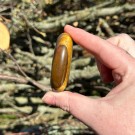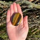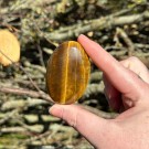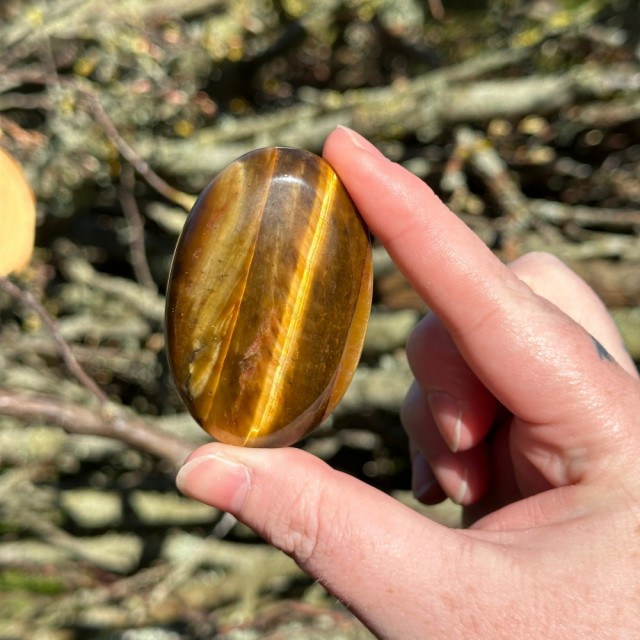 Nydelig gullskinnende Tigerøye. Denne håndsteinen er 6x4x1,8cm og veier ca 74g. Det er den på bildene du får hvis du bestiller denne. Bildene er tatt ute i sollys.
