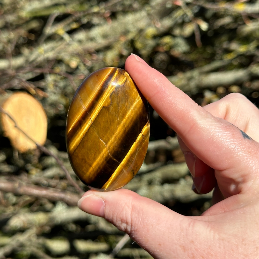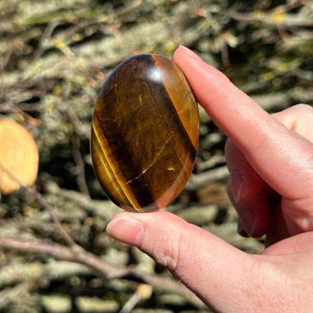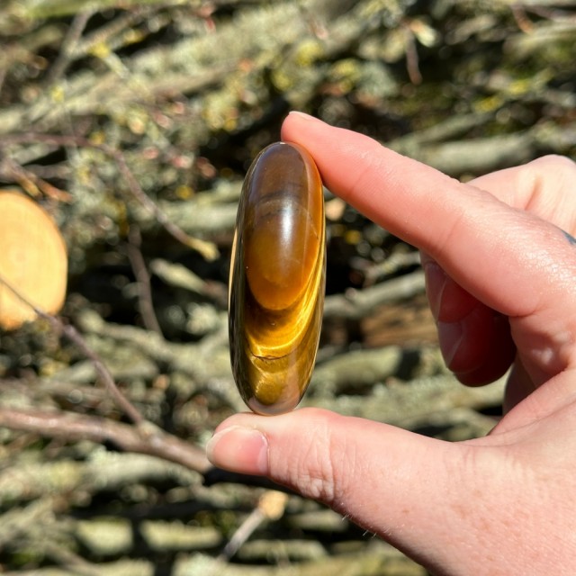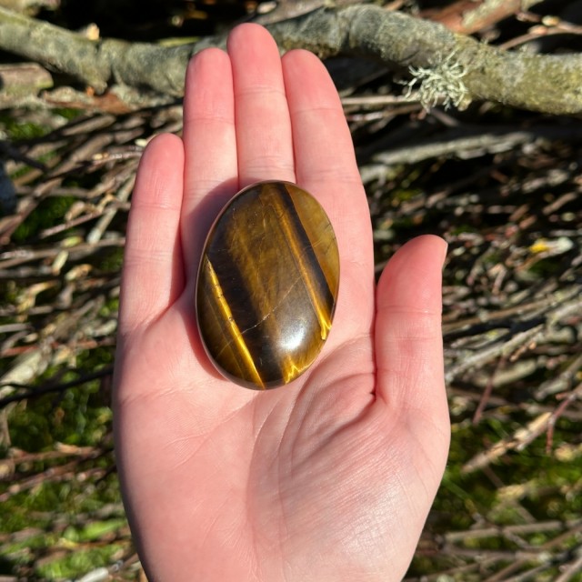 Nydelig gullskinnende Tigerøye. Denne håndsteinen er 6x4x2,1cm og veier ca 77g. Det er den på bildene du får hvis du bestiller denne. Bildene er tatt ute i sollys.