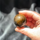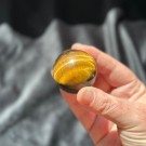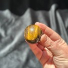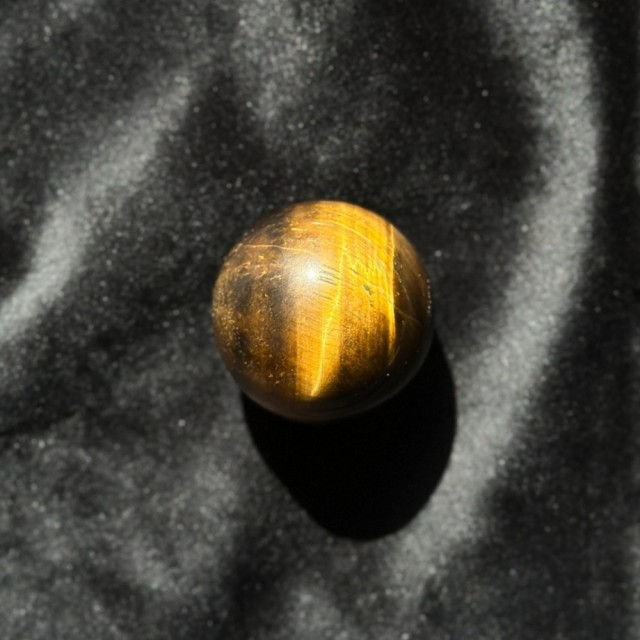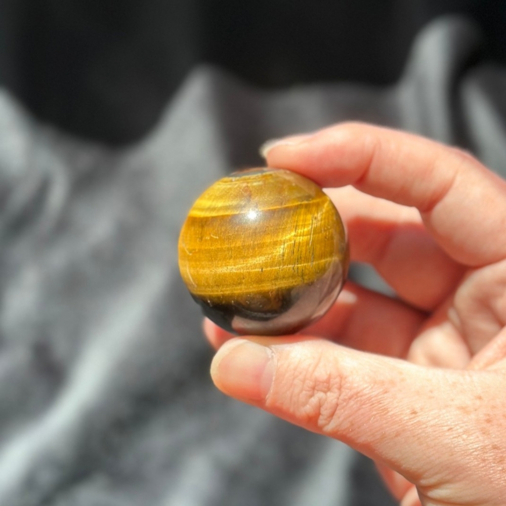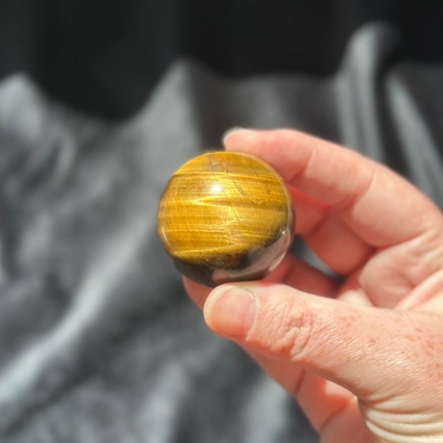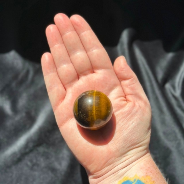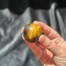 En nydelig liten gullskinnende Tigerøye kule på 4,1cm og ca. 98g - et glødende symbol på styrke, mot og selvsikkerhet. Med sitt hypnotiske skinn beskytter den mot negativitet, balanserer energi og bringer et snev av ren solmagi inn i ditt hjem.