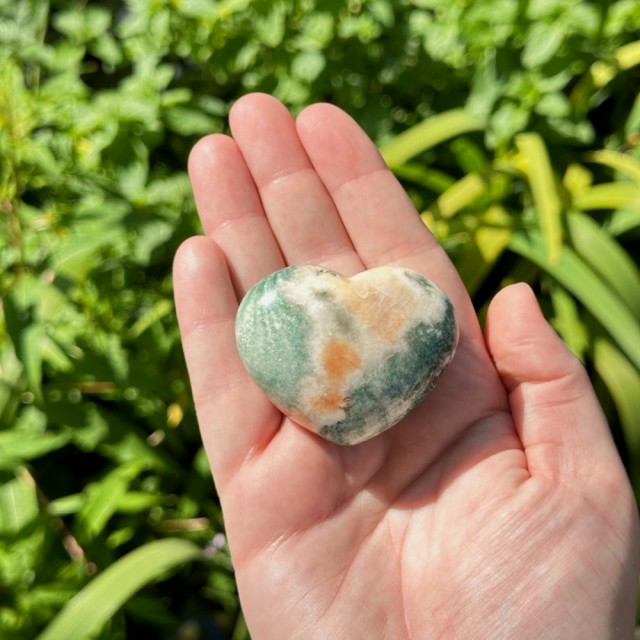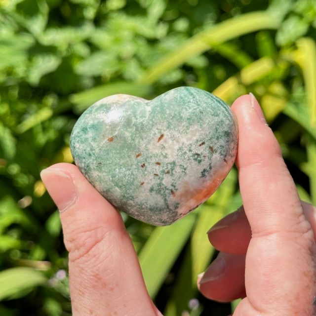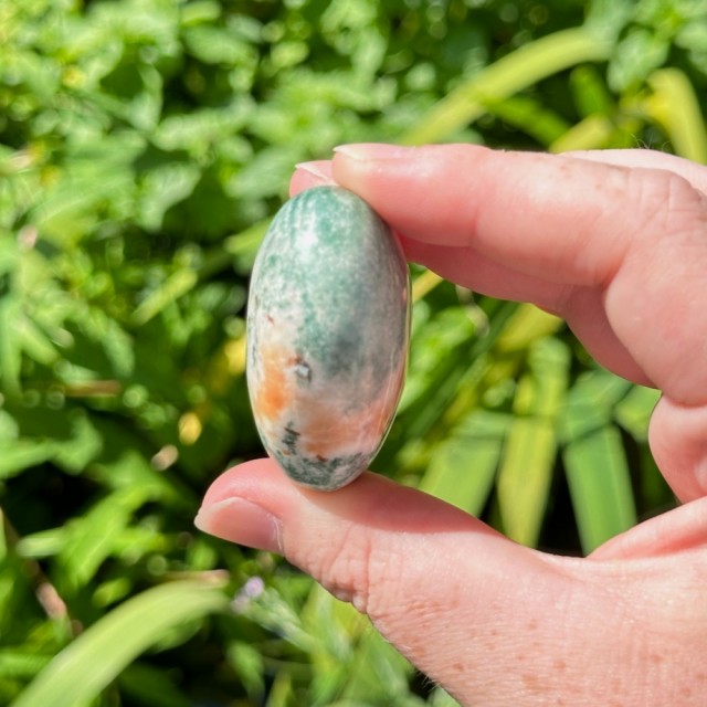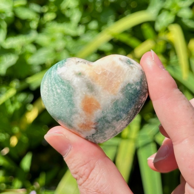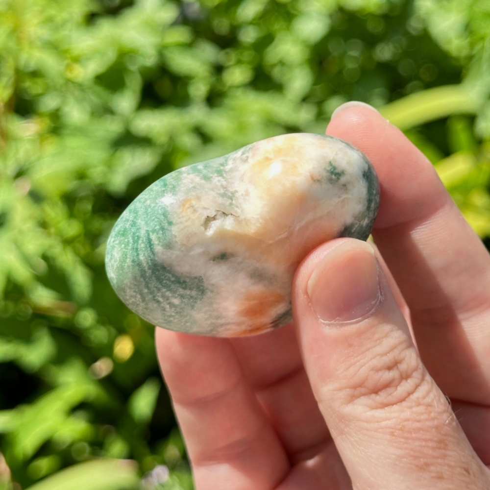 Nydelig kombinasjon av Tre Agat, Heulanditt og Skolesitt. Denne veier ca 62g og er 4,7x5,8x2,9cm. Det er den krystallen på bildene du får hvis du bestiller denne. Bildene er tatt ute i sollys. OBS: Naturlige merker, hulrom og "cracks" forekommer på disse!