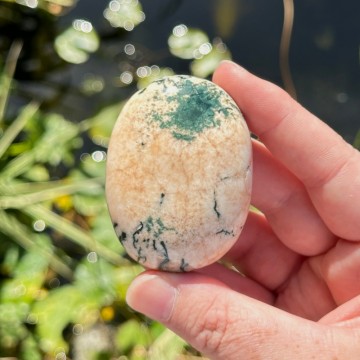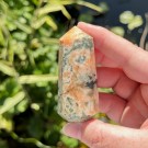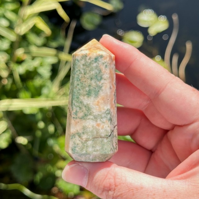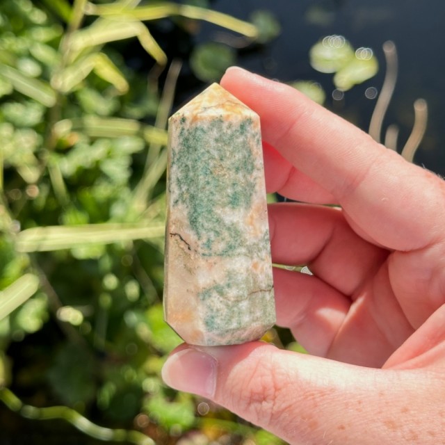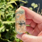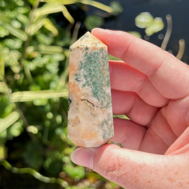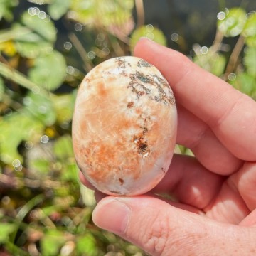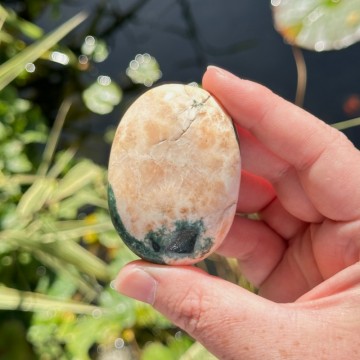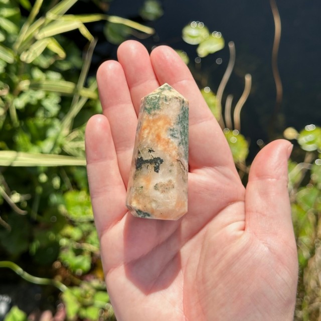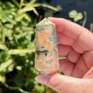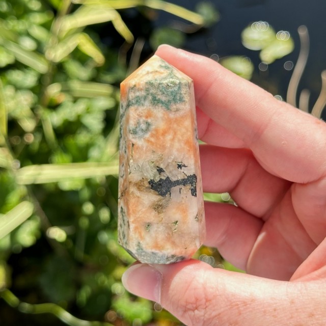 Nydelig kombinasjon av Tre Agat, Heulanditt og Skolesitt. Denne veier ca 67g og er 7,1cm. Det er den krystallen på bildene du får hvis du bestiller denne. Bildene er tatt ute i sollys. OBS: Naturlige merker, hulrom og "cracks" forekommer på disse!